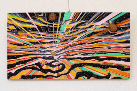 独自の絵画技法 Cosmic Rhythmを廃材で制作した作品であり、宇宙のリズムと人間の物語の合作品であることを表現している。