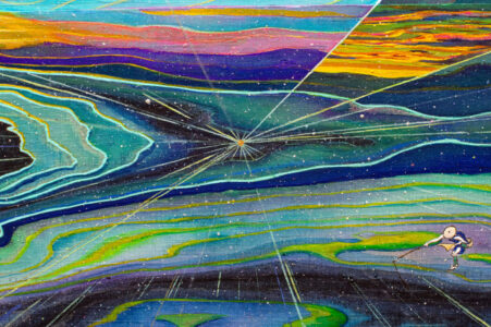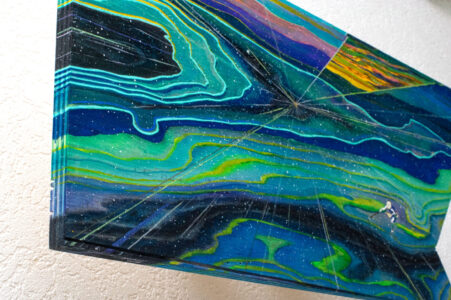 本作は、木目を宇宙のリズムとして捉え、その流れに沿って描く独自の絵画技法「Cosmic Rhythm」によって制作された。木目とは、時の流れや天候、重力、季節、自転など――自然の力が刻んだ痕跡であり、まさに宇宙のリズムそのものだと考える。その流れに筆を合わせることで、「全てはひとつ(Oneness)」という世界観を描き表現している。