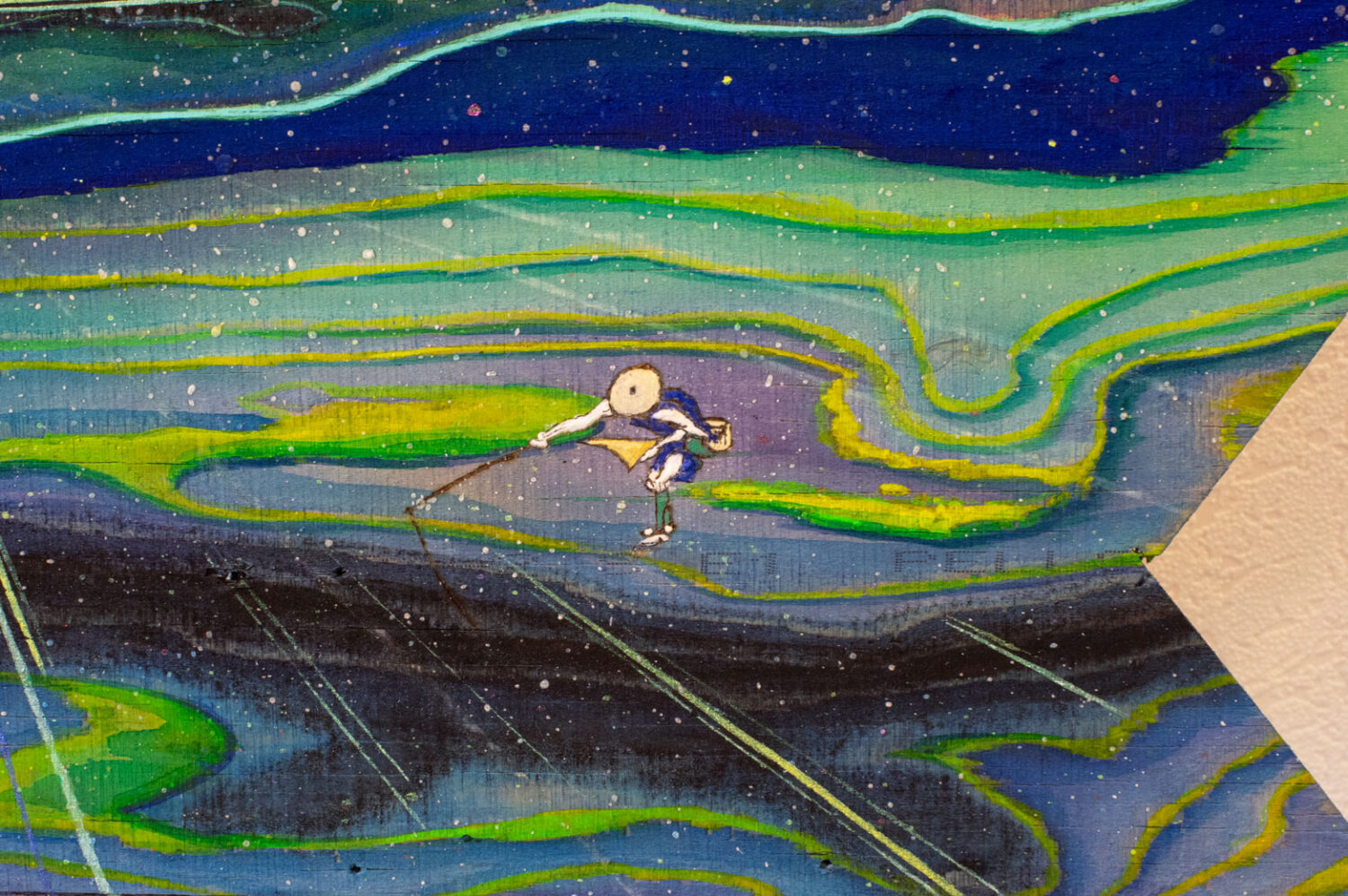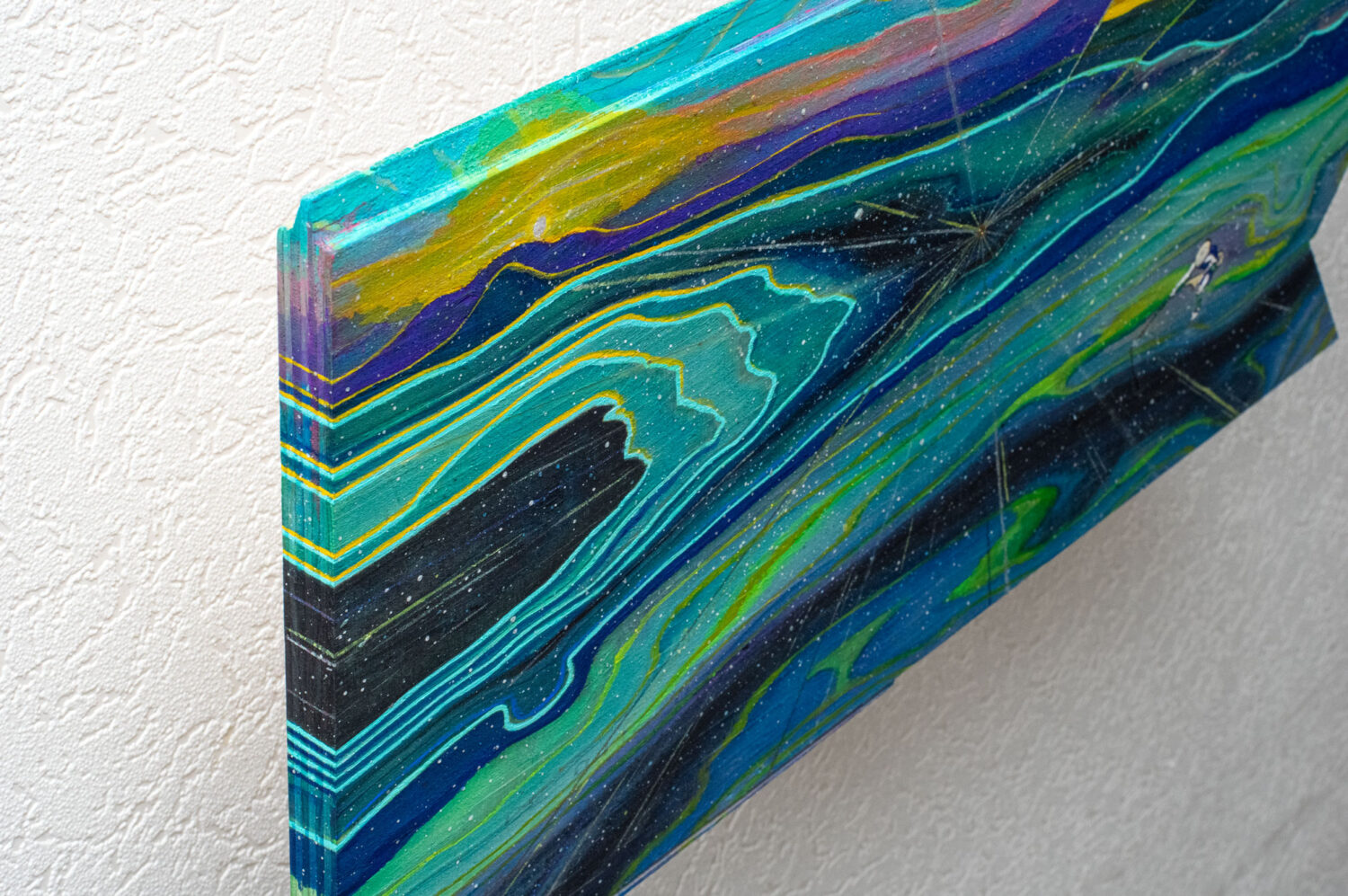 画材:アクリル、蓄光塗料、偏光顔料、岩絵具、ペン、24K 純金箔、ウッドバーニング、廃木材
