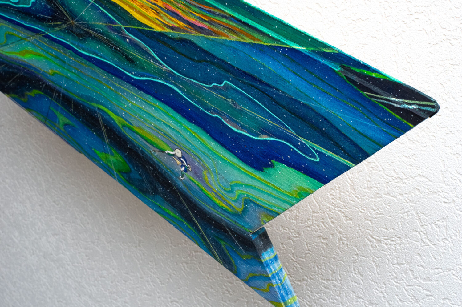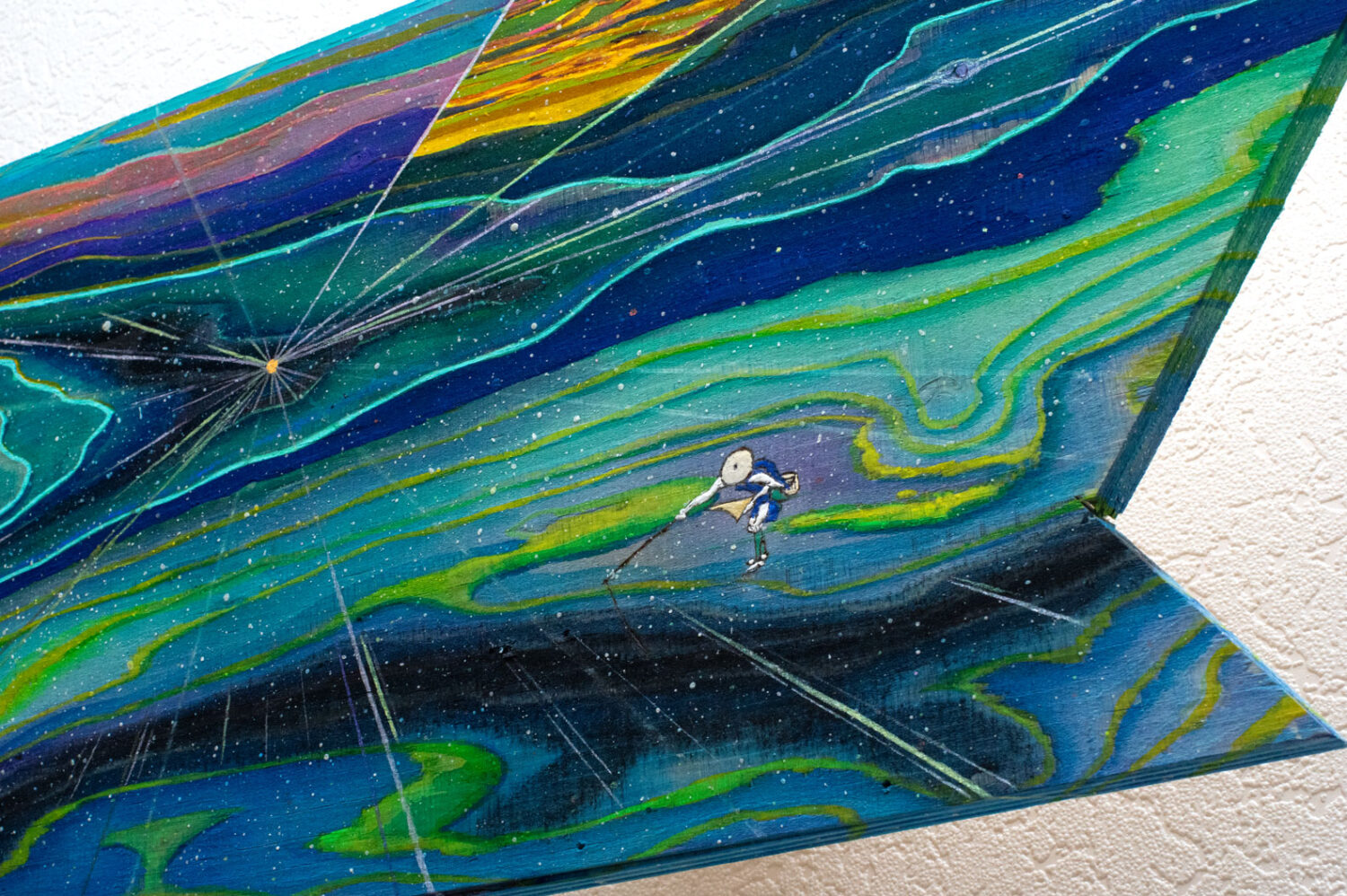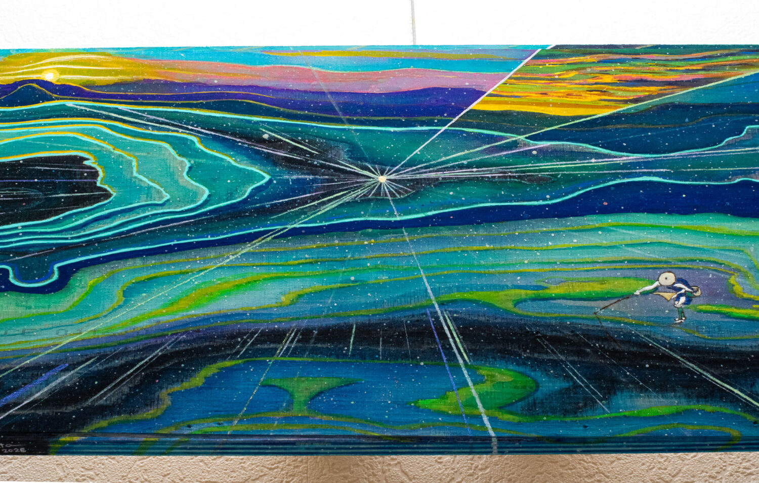 本作は、木目を宇宙のリズムとして捉え、その流れに沿って描く独自の絵画技法「Cosmic Rhythm」によって制作された。木目とは、時の流れや天候、重力、季節、自転など――自然の力が刻んだ痕跡であり、まさに宇宙のリズムそのものだと考える。その流れに筆を合わせることで、「全てはひとつ(Oneness)」という世界観を描き表現している。