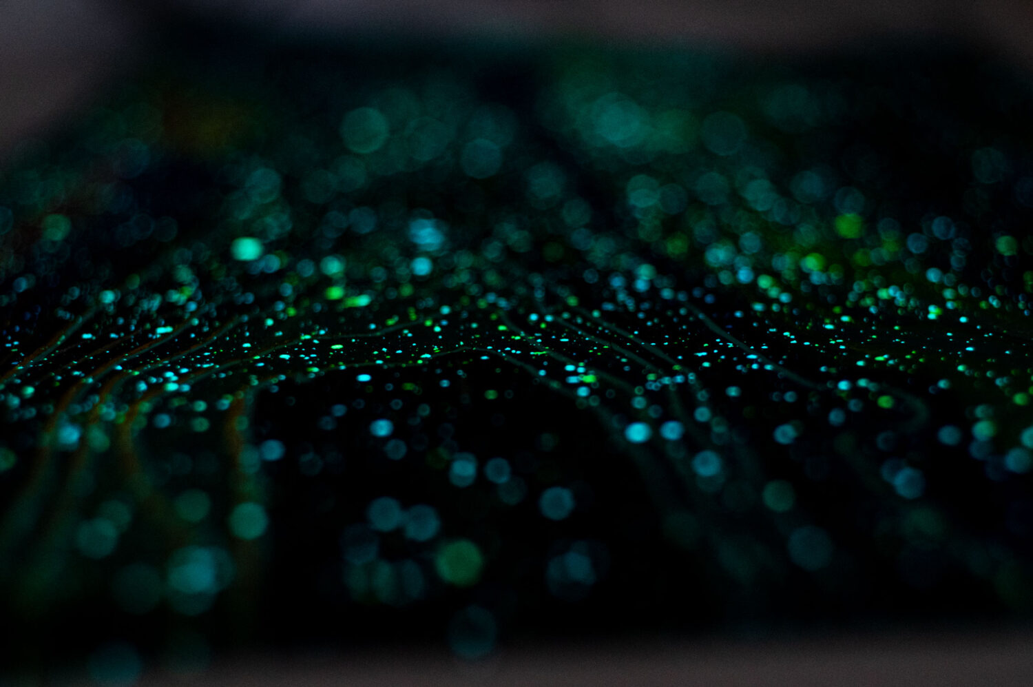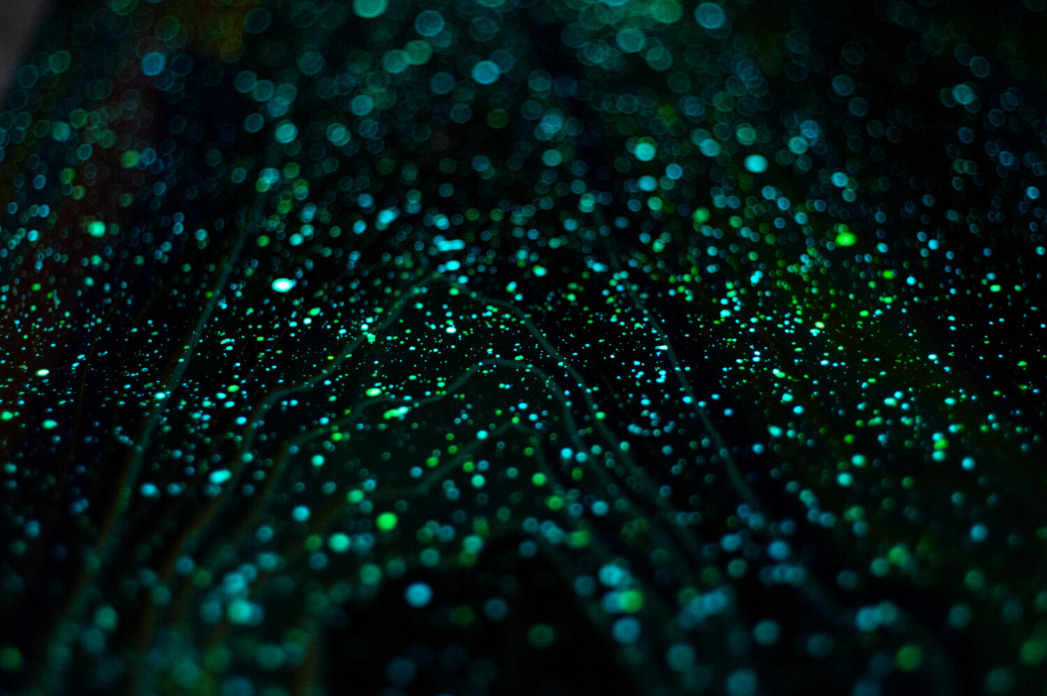 蓄光塗料や偏光顔料を取り入れることで、光の変化によって多様な表情を見せる。暗闇の中では柔らかく光を放ち、その輝きは遠い星々のようにも、あるいは素粒子やエネルギーの瞬きのようにも見える。中心には本物の24K純金箔を用い、永遠に変わらぬ黄金の輝きを静かに放ち続けている。