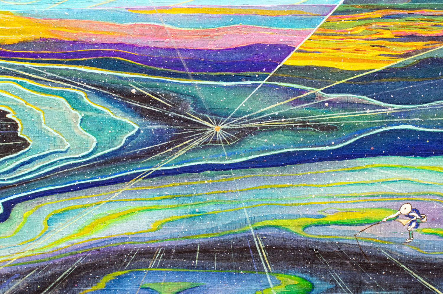 Acrylic, Phosphorescent pigment, Chameleon pigment, Mineral pigments, Pyrography, Pen, 24K gold leaf, on reclaimed wood