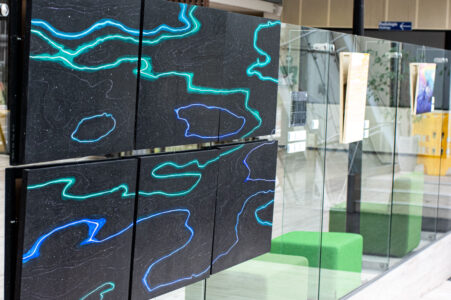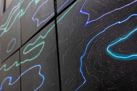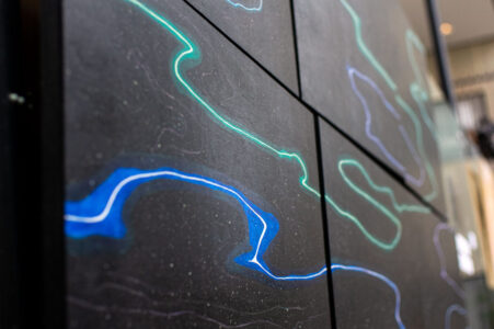 This work was created by following the natural grain patterns of the wood—patterns formed by nature, by the cosmos itself. It seeks to visualize the rhythm of the cosmos. It is painted with special luminous pigments, and in darkness, it gently glows. Light and darkness—two opposites—exist together in harmony, and by night, the painting reveals another side of itself. We often wish to avoid the dark. Yet it is because of the dark that light can shine. It is how we come to truly understand love—to shine for someone, to shine for the world. This is the message woven into the work.