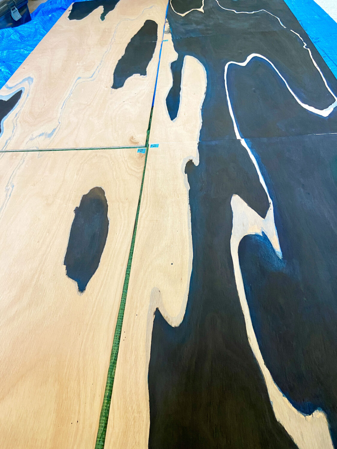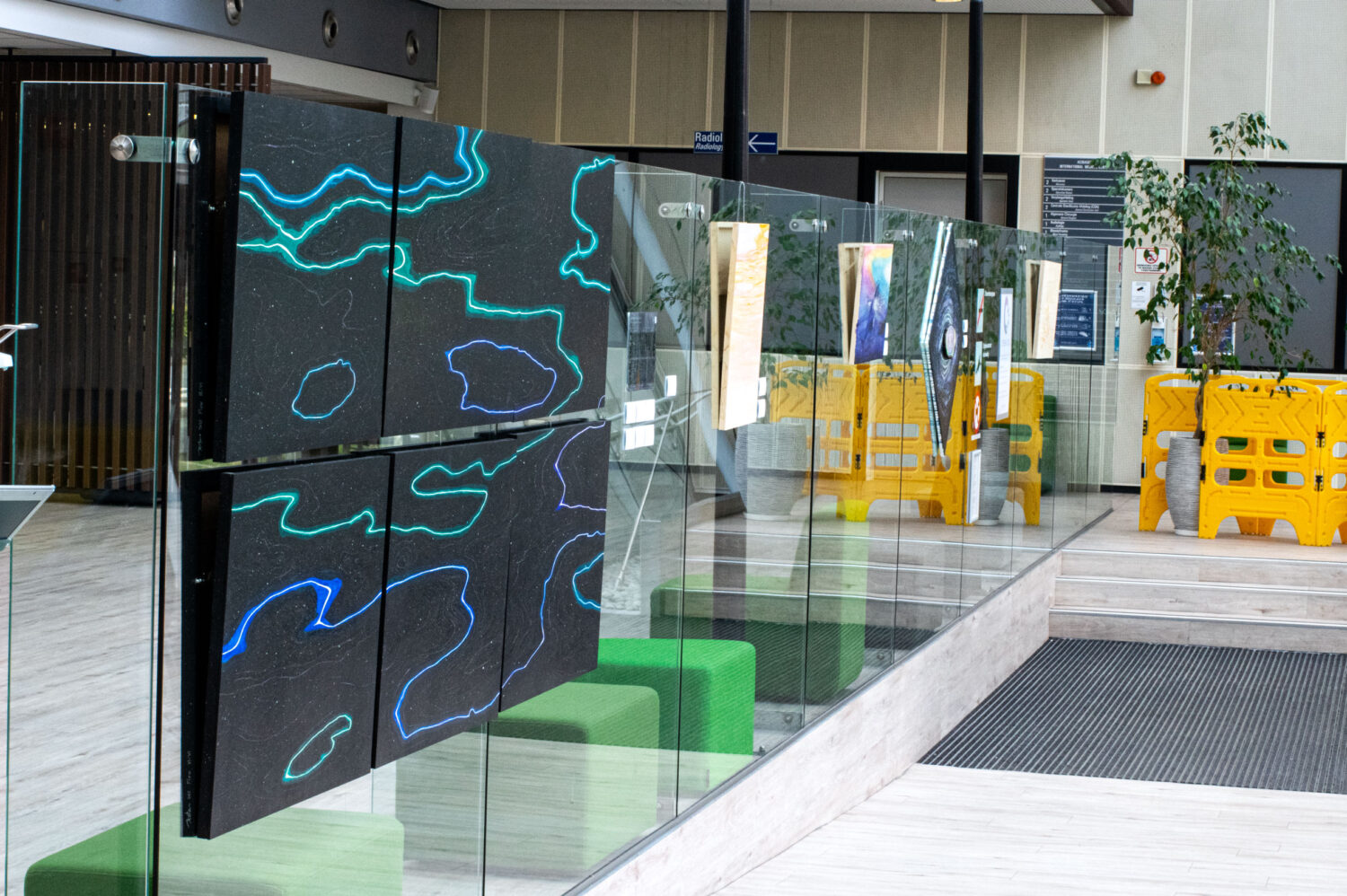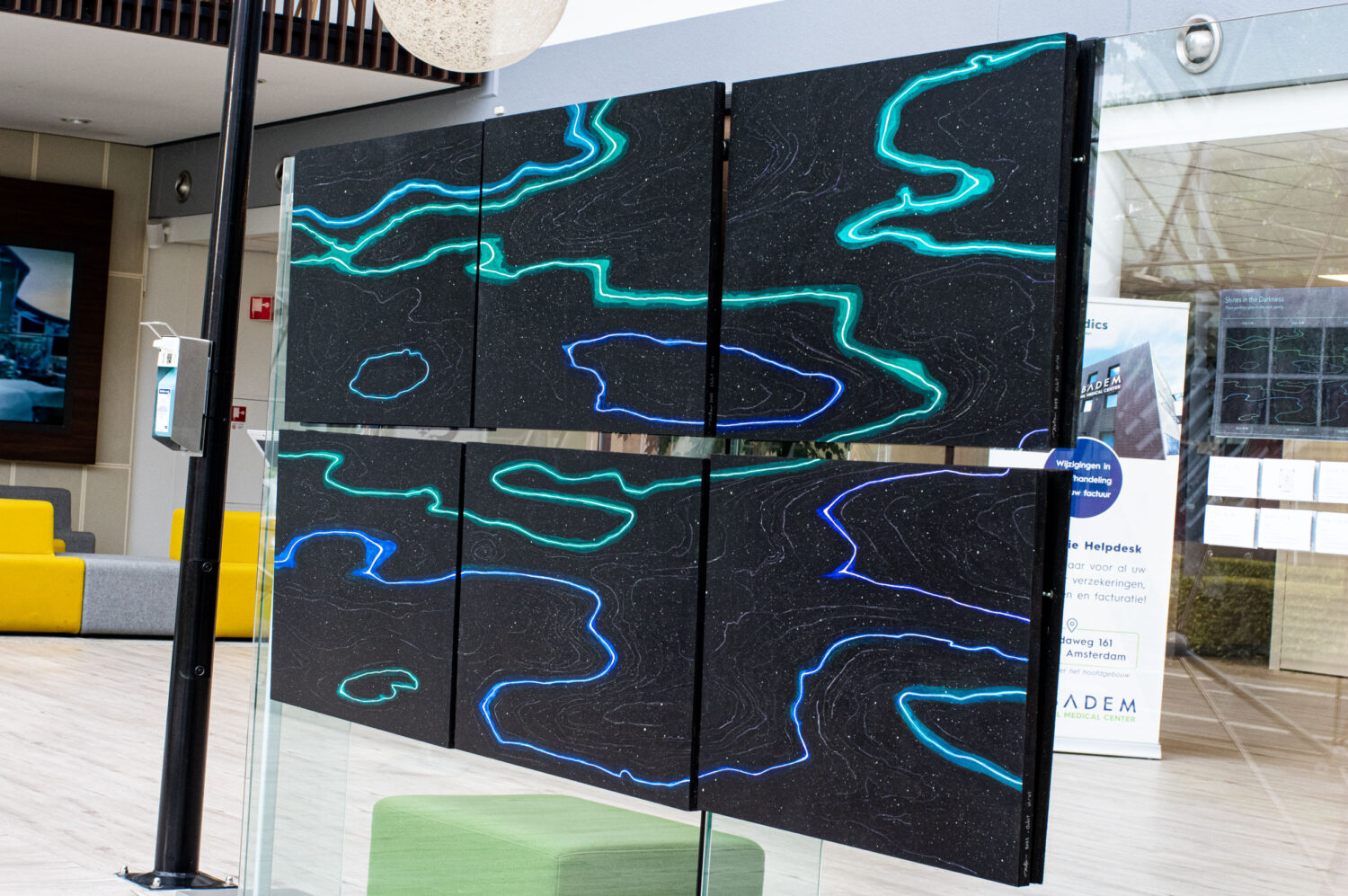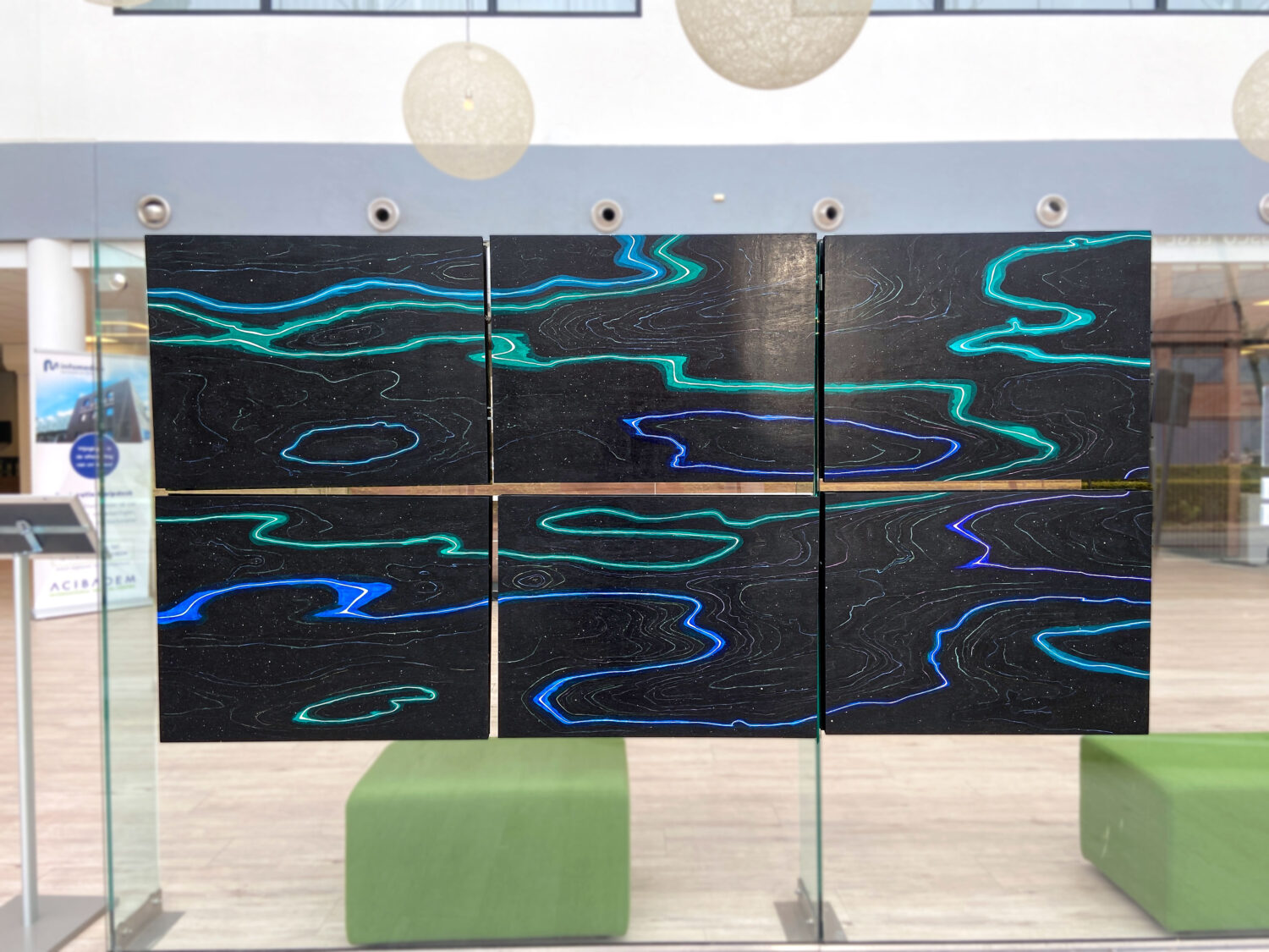This work was created by following the natural grain patterns of the wood—patterns formed by nature, by the cosmos itself. It seeks to visualize the rhythm of the cosmos. It is painted with special luminous pigments, and in darkness, it gently glows. Light and darkness—two opposites—exist together in harmony, and by night, the painting reveals another side of itself. We often wish to avoid the dark. Yet it is because of the dark that light can shine. It is how we come to truly understand love—to shine for someone, to shine for the world. This is the message woven into the work.