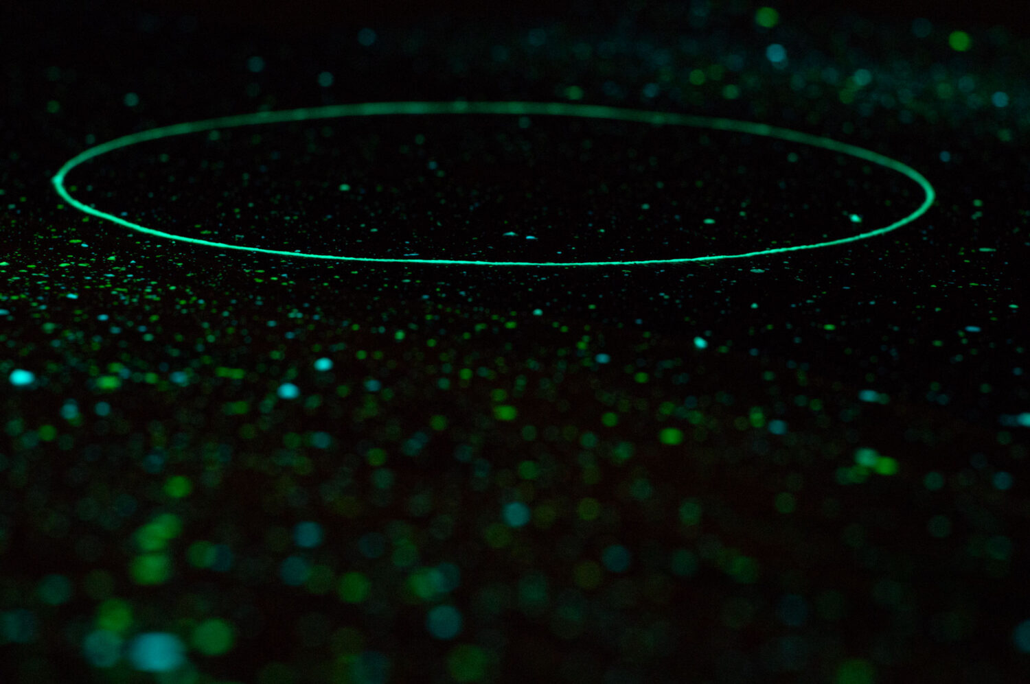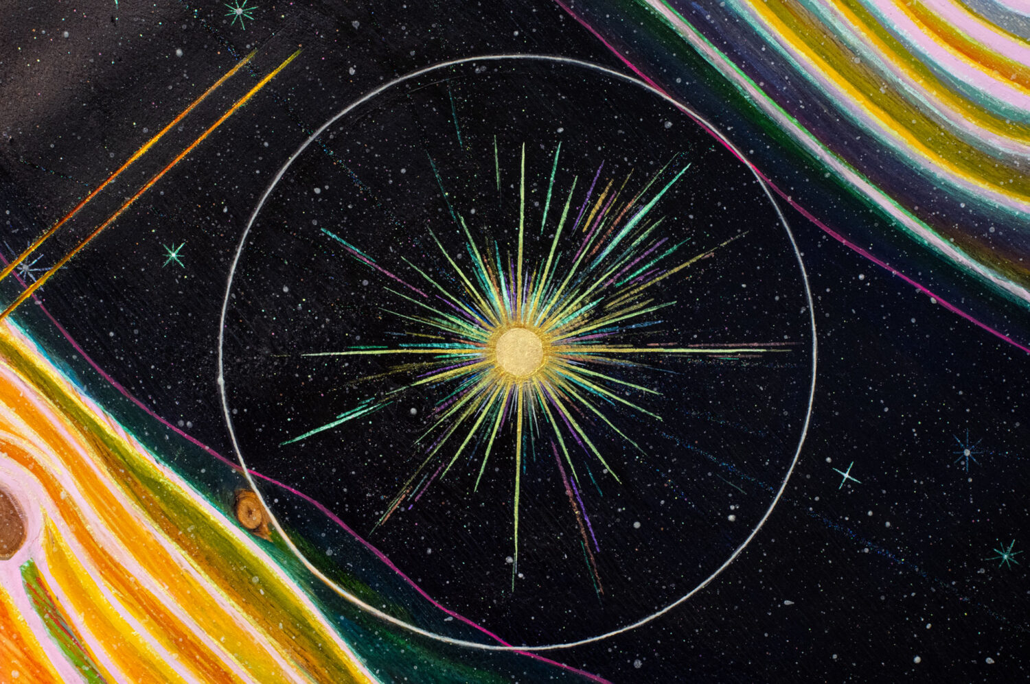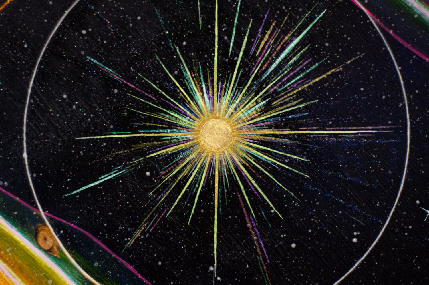 蓄光塗料や偏光顔料を取り入れたことにより、鑑賞者は多様な見方の経験が出来るようになっている。光の中央には本物の24Kの金箔を使用。その性質から永遠に変わらない黄金の輝きを放ち続ける。