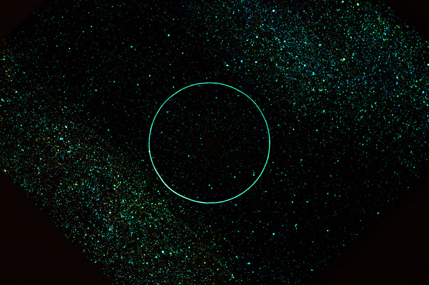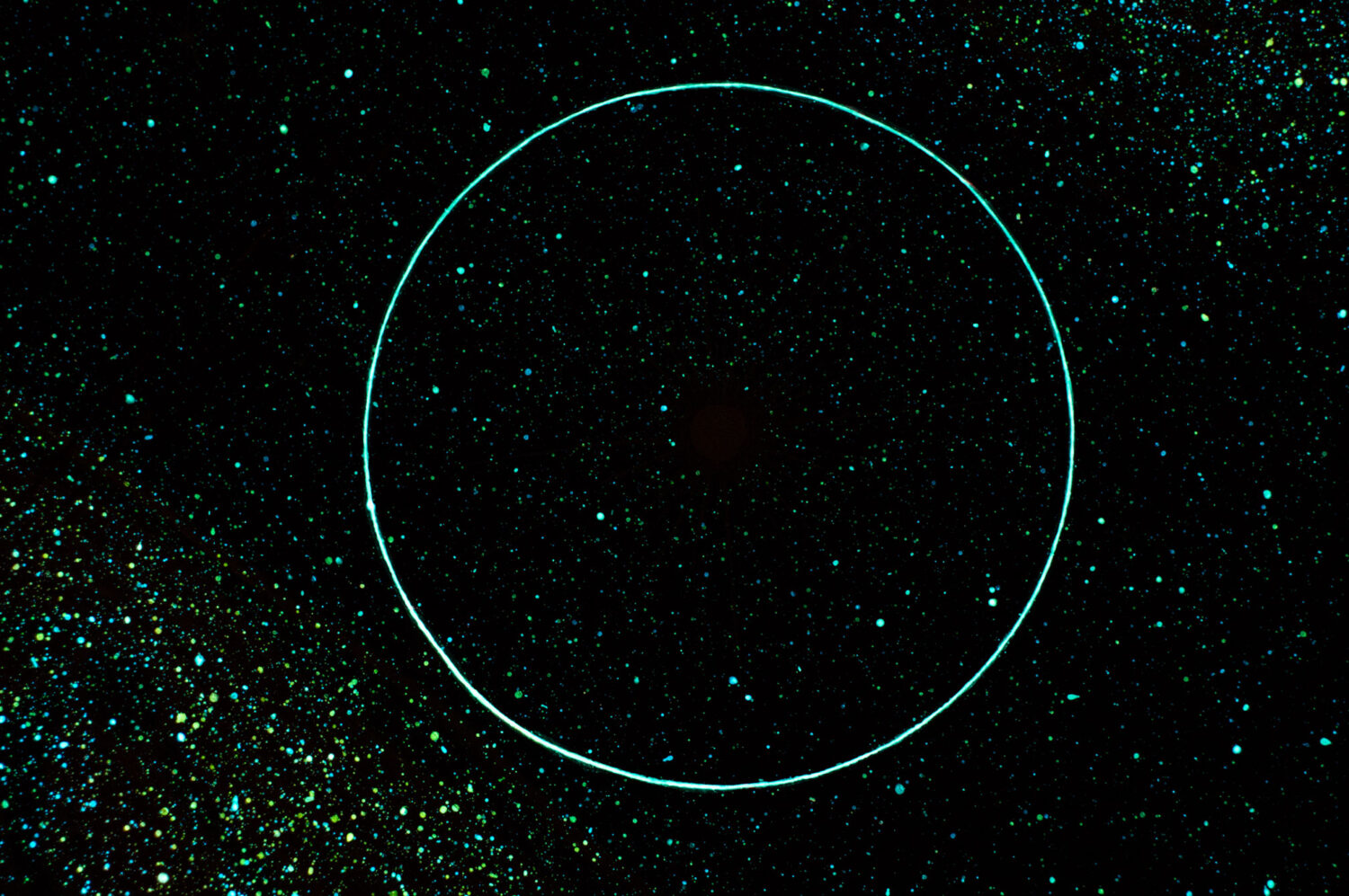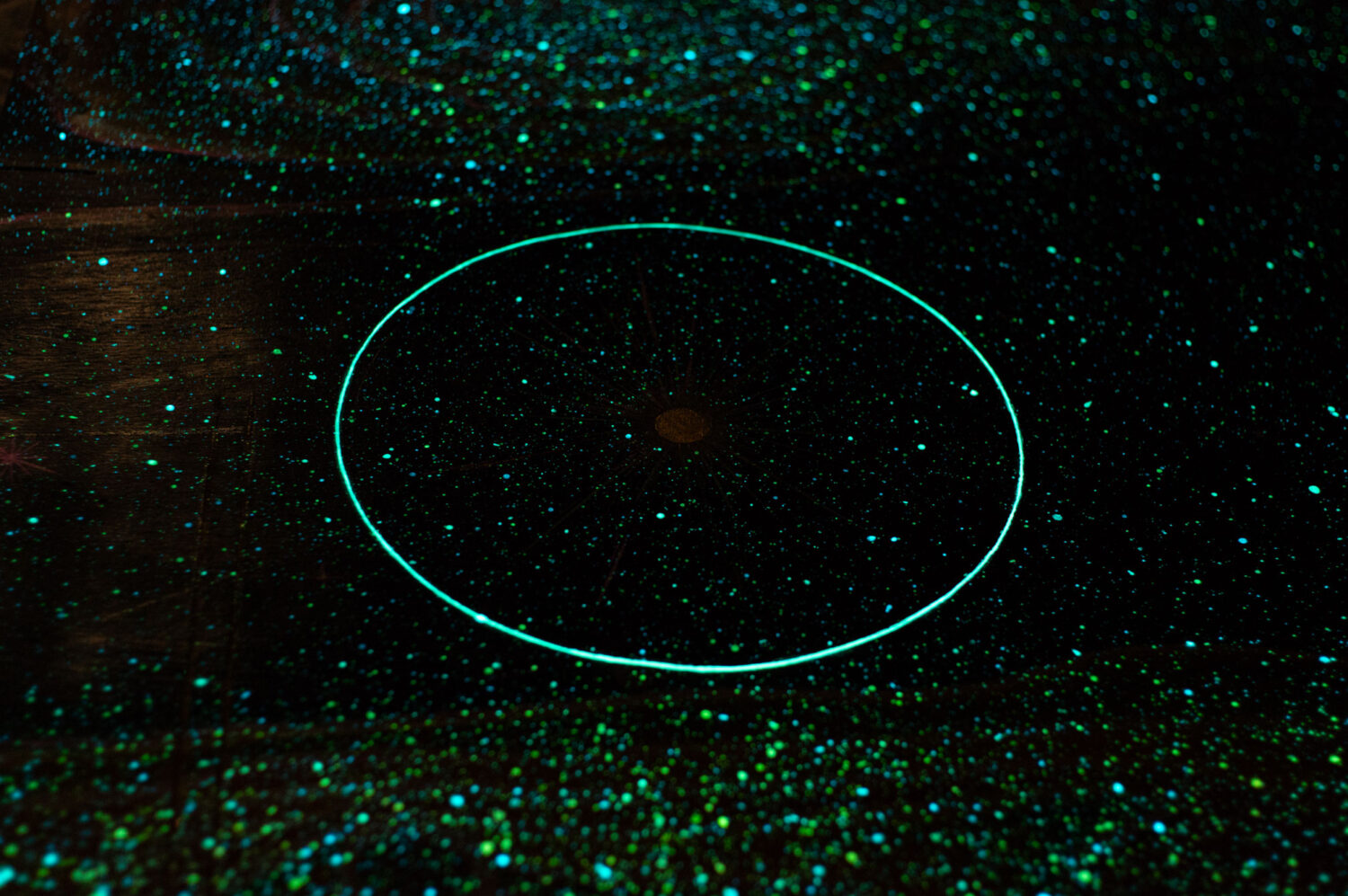 蓄光塗料や偏光顔料を取り入れたことにより、鑑賞者は多様な見方の経験が出来るようになっている。光の中央には本物の24Kの金箔を使用。その性質から永遠に変わらない黄金の輝きを放ち続ける。