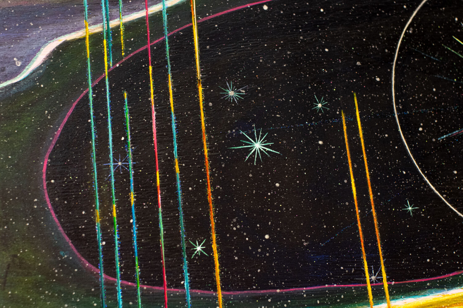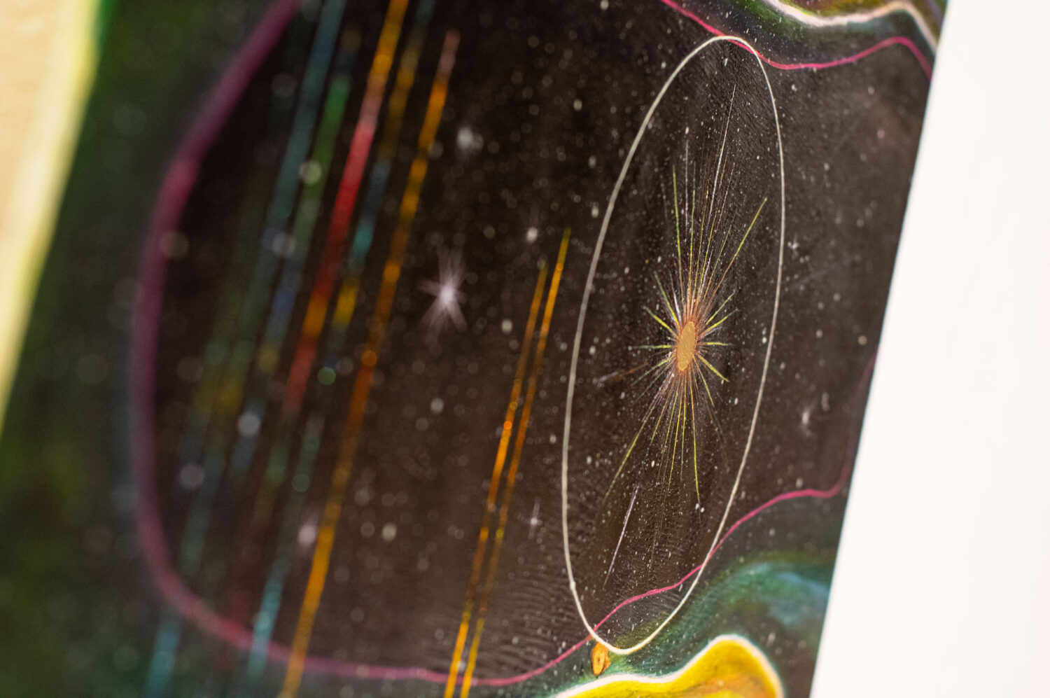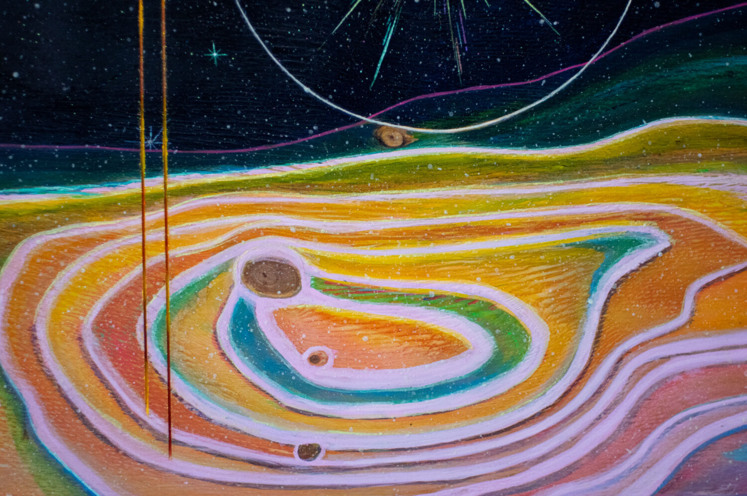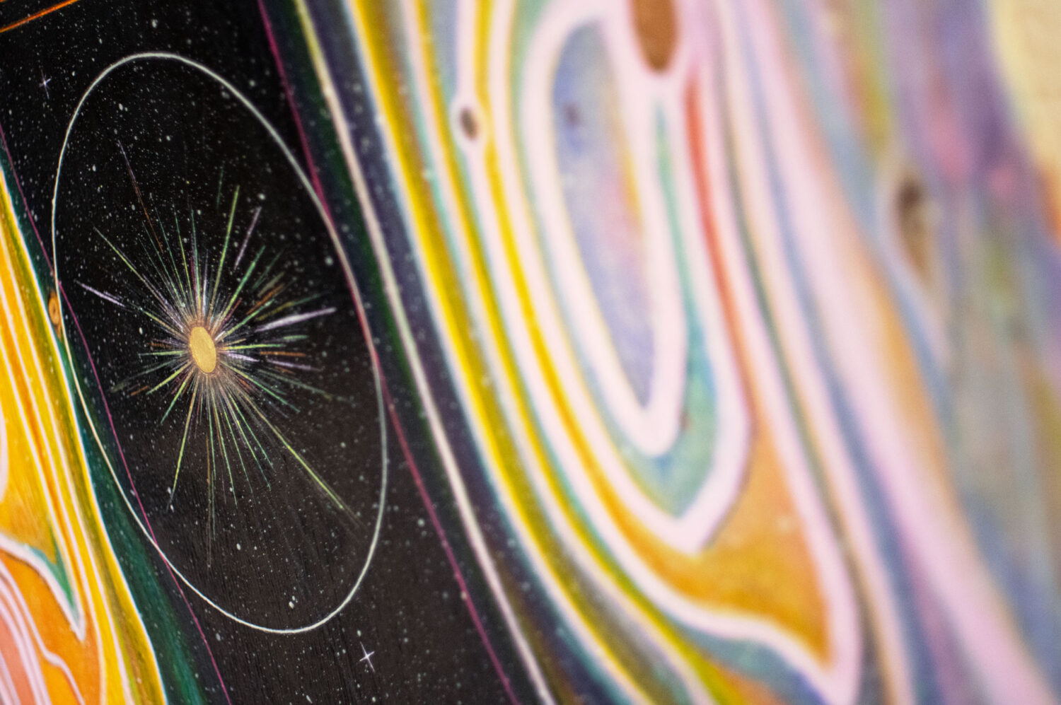 独自の絵画技法 Cosmic Rhythmを廃材で制作した作品であり、宇宙のリズムと人間の物語の合作品であることを表現している。