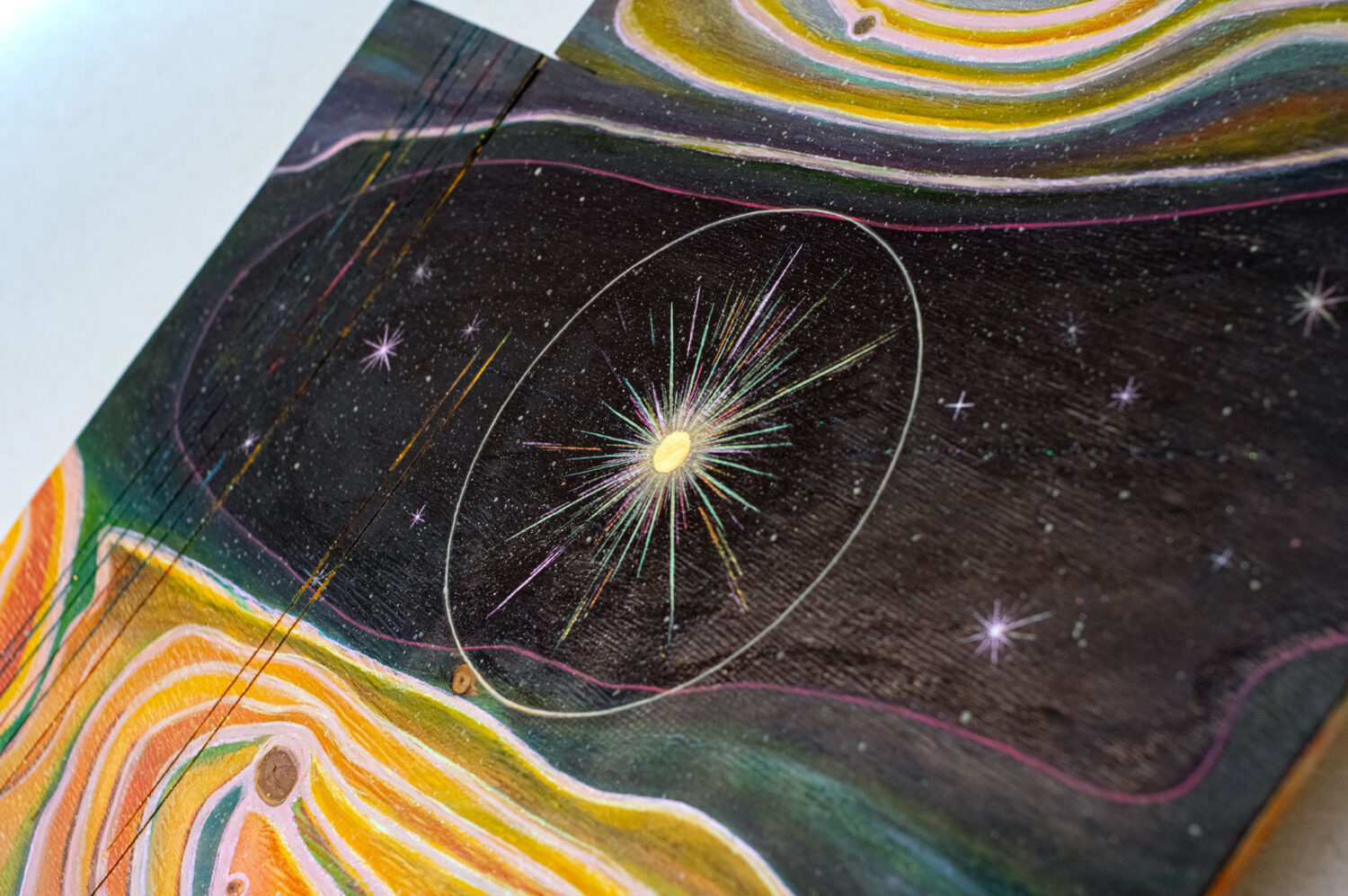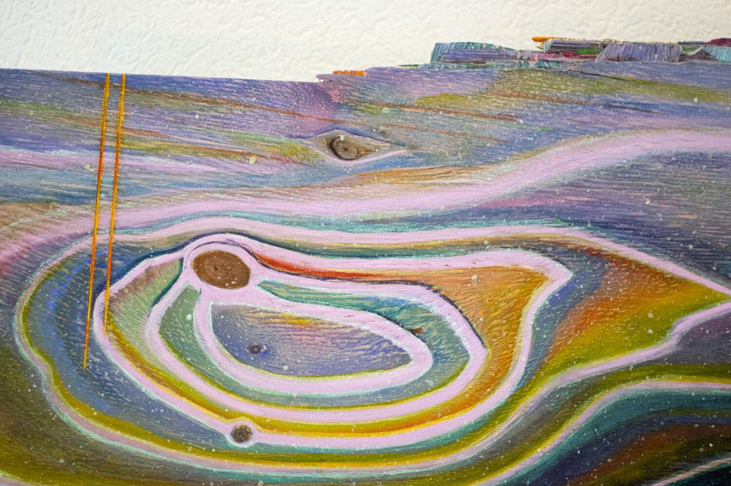 木目とは宇宙のリズムそのもの(時、天候、重力、季節、自転など)を可視化したものと考える。宇宙のリズムである木目に沿って、人間である私が描くことでワンネス(全ては一つ)を表現している。