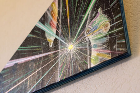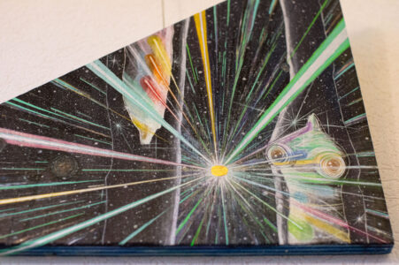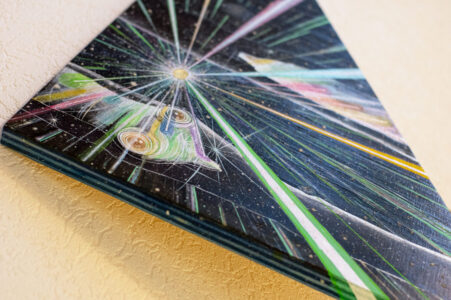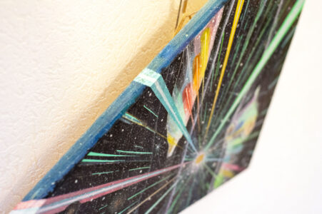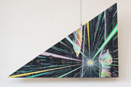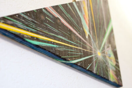 独自の絵画技法 Cosmic Rhythmを廃材で制作した作品であり、宇宙のリズムと人間の物語の合作品であることを表現している。