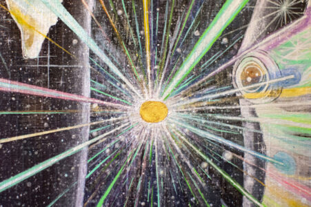 蓄光塗料や偏光顔料を取り入れたことにより、鑑賞者は多様な見方の経験が出来るようになっている。光の中央には本物の24Kの金箔を使用。その性質から永遠に変わらない黄金の輝きを放ち続ける。