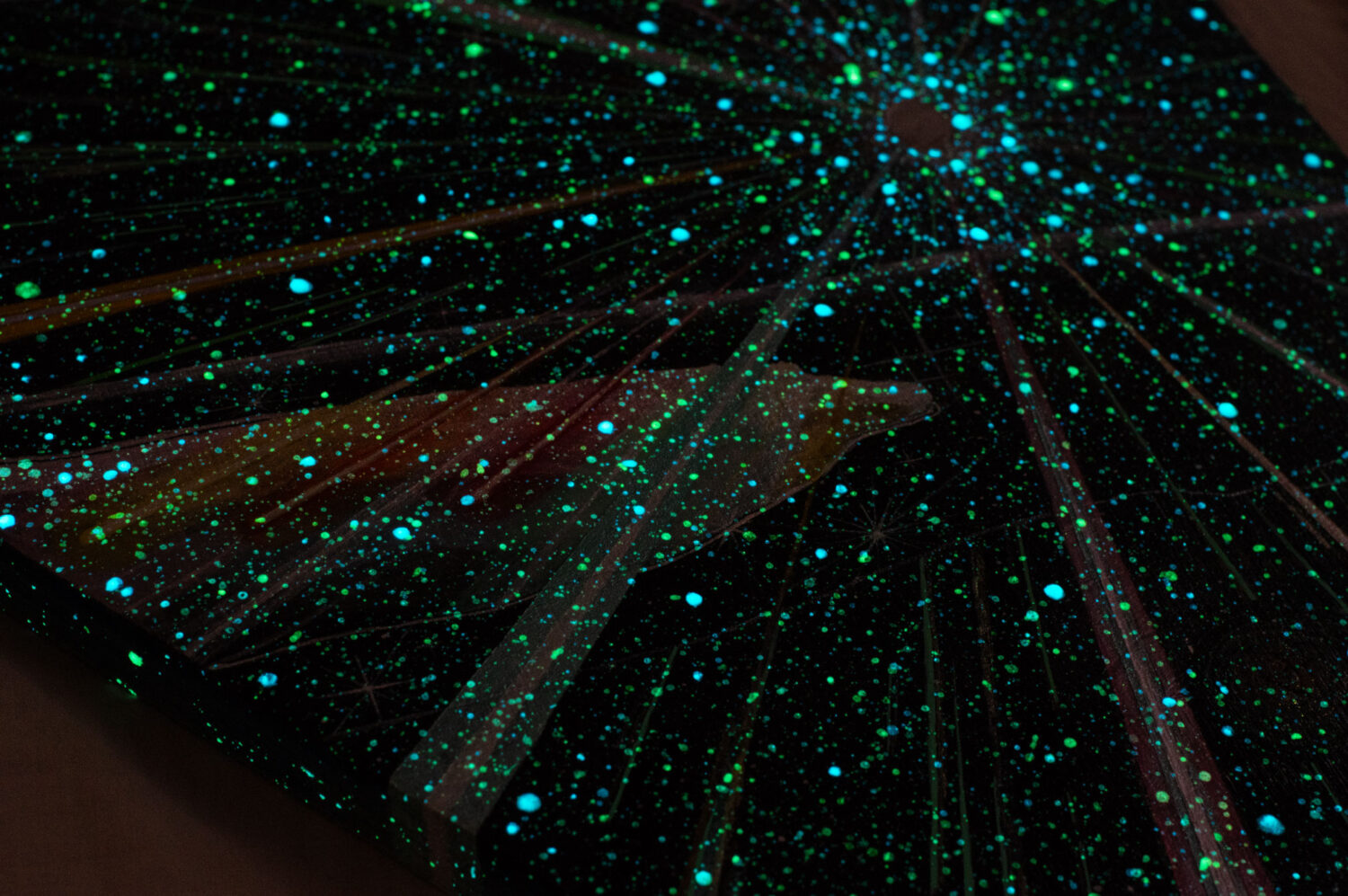 蓄光塗料や偏光顔料を取り入れたことにより、鑑賞者は多様な見方の経験が出来るようになっている。光の中央には本物の24Kの金箔を使用。その性質から永遠に変わらない黄金の輝きを放ち続ける。
