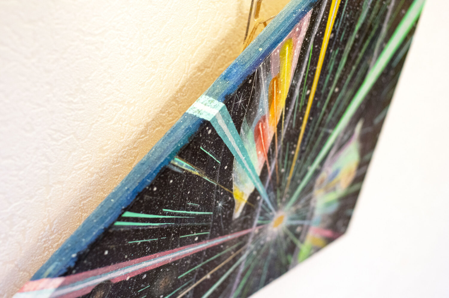 画材:アクリル、蓄光塗料、偏光顔料、メディウム、24K 純金箔、廃木材