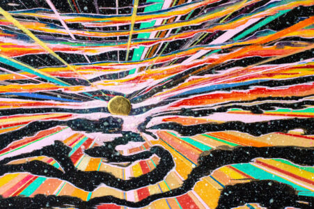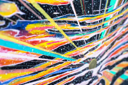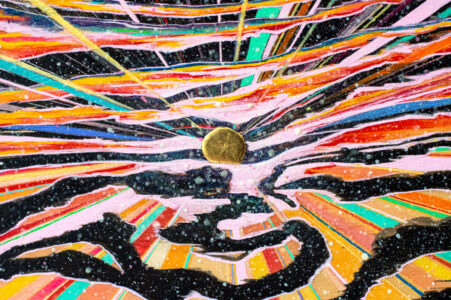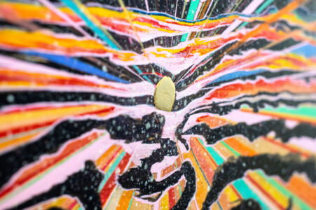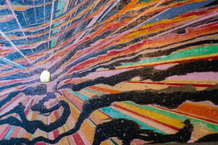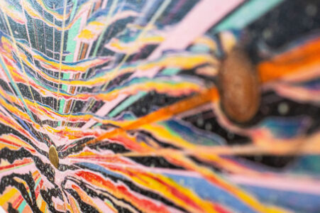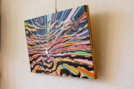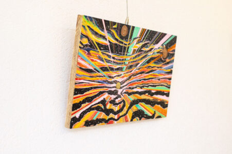 独自の絵画技法 Cosmic Rhythmを廃材で制作した作品であり、宇宙のリズムと人間の物語の合作品であることを表現している。