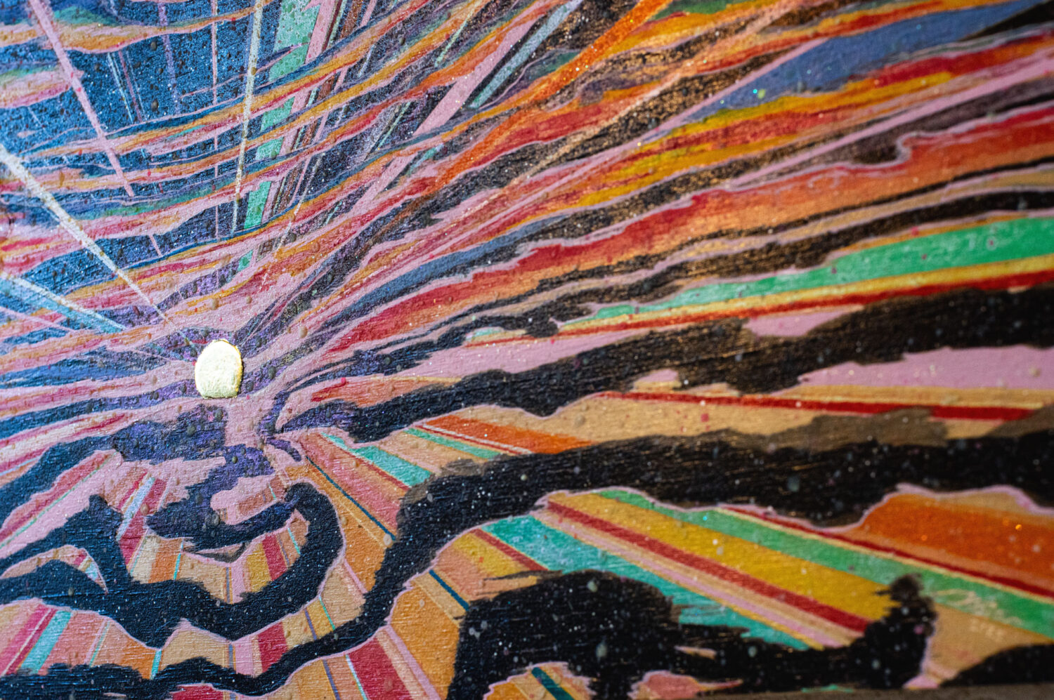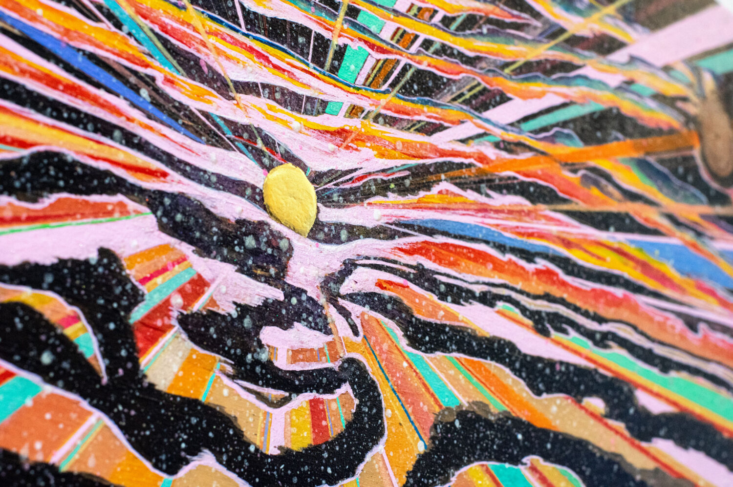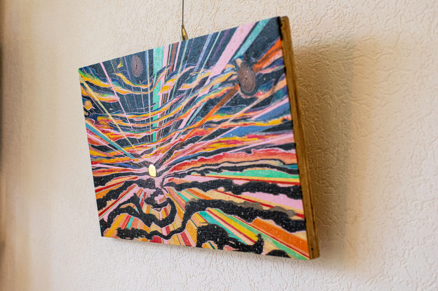 独自の絵画技法 Cosmic Rhythmを廃材で制作した作品であり、宇宙のリズムと人間の物語の合作品であることを表現している。