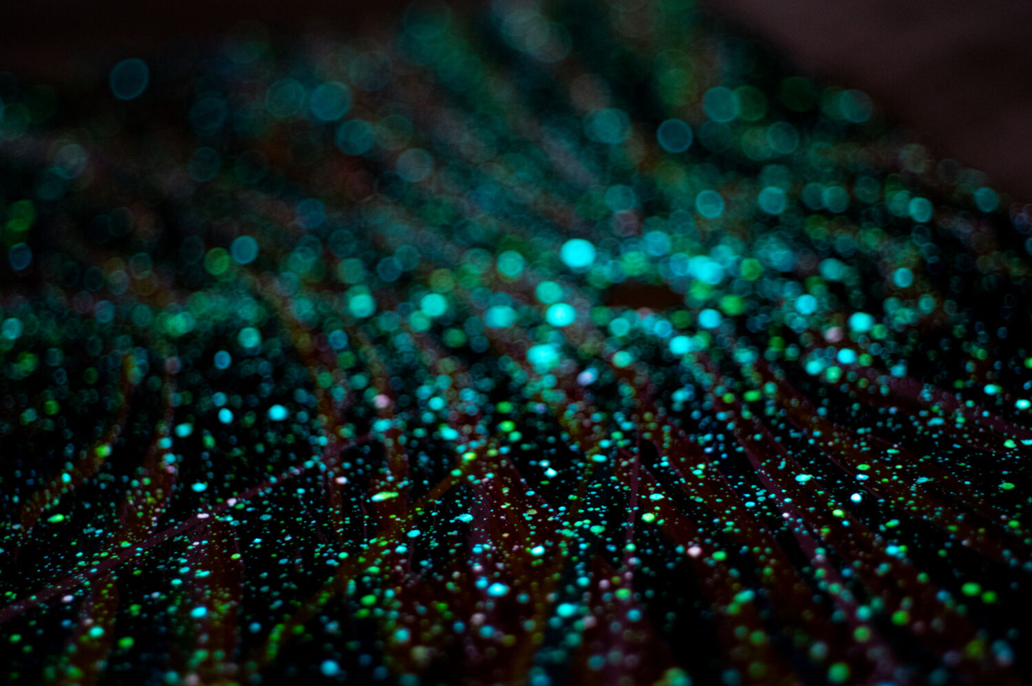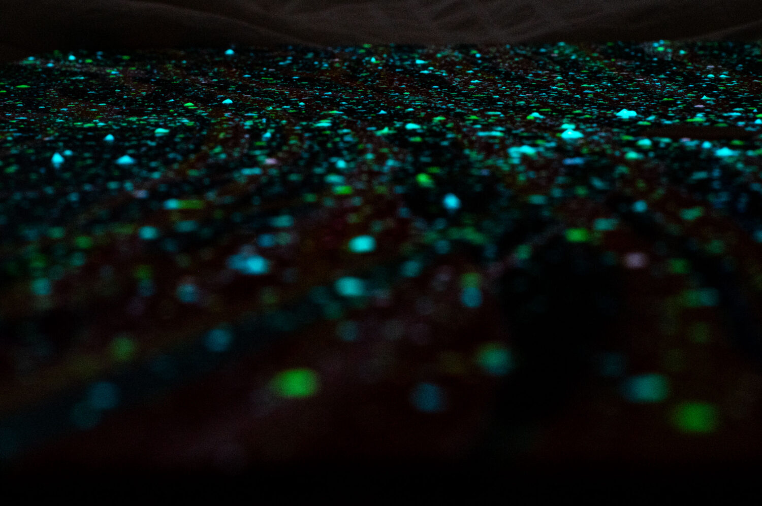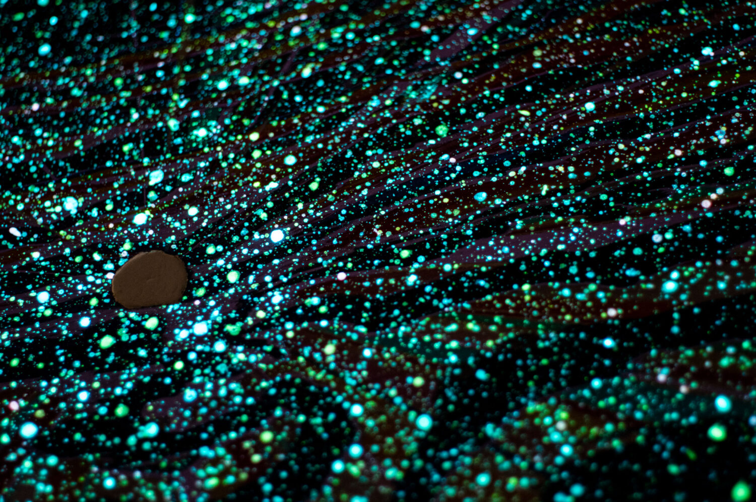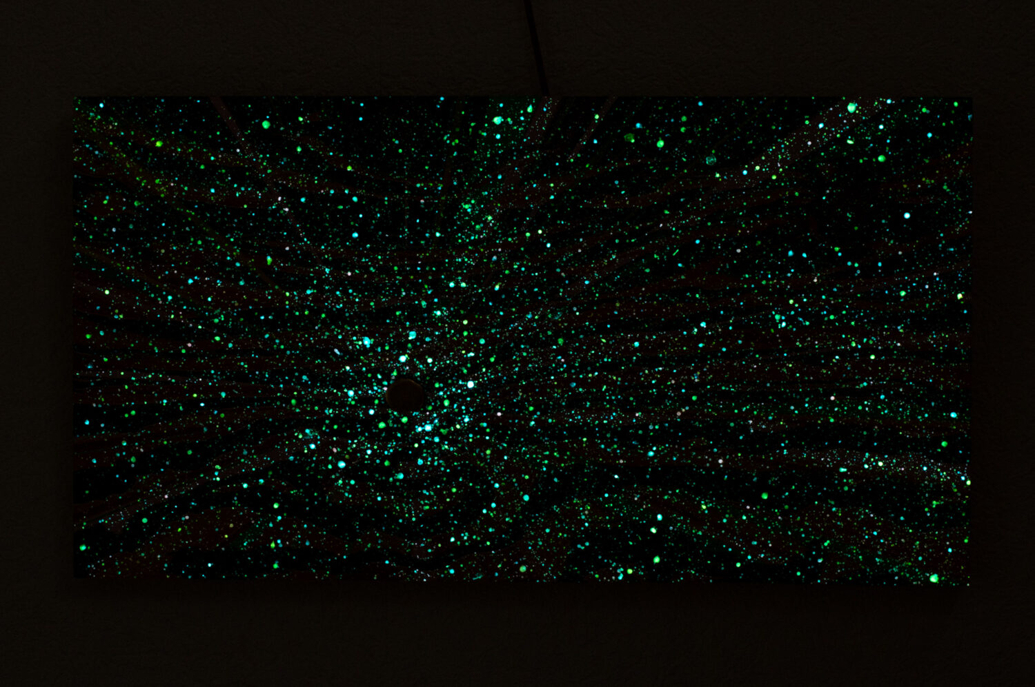 蓄光塗料や偏光顔料を取り入れたことにより、鑑賞者は多様な見方の経験が出来るようになっている。光の中央には本物の24Kの金箔を使用。その性質から永遠に変わらない黄金の輝きを放ち続ける。